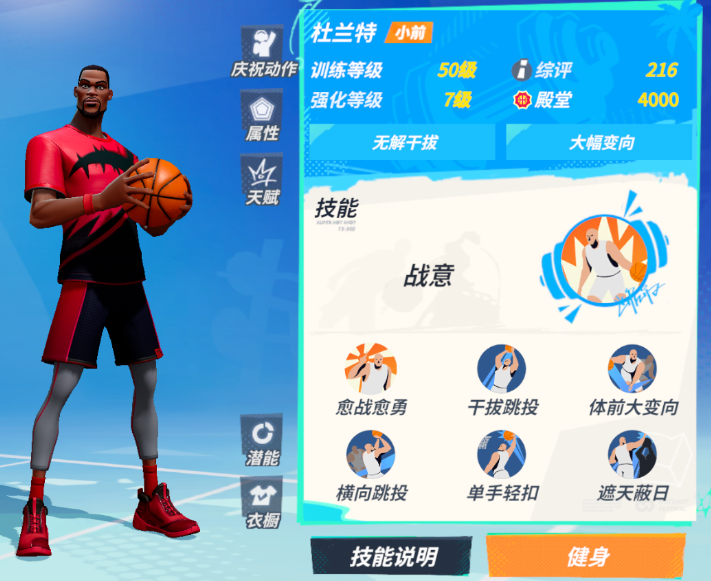 杜兰特:这是一个擅长顶投和处理关键球的高个前锋,他的爆发技“战意”在使用后会令其多个小技能得到强化,从而展现出更强的进攻表现,而被动则会根据自己现有的士气值来增加命中率和抗干扰能力,顶投时的进球概率因此变得更高。