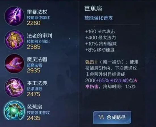 目前游戏中的法术装备强度比较高的就是以上这些啦,这些装备不难看出来,主要是从冷却缩减,以及控制收益和续航能力来设定的,玩家们可以了解装备的特性之后,在根据角色的技能来进行搭配是比较合适的选择,而中路鞋子方面,小编个人是比太想做推荐的,除了时光鞋可以是比较好的选择之外,有时候还会用到抵抗鞋,在对局古城中如果敌方刺客角色威胁能力比较大的话,也是可以进行更换的!