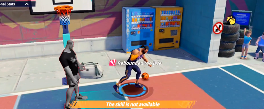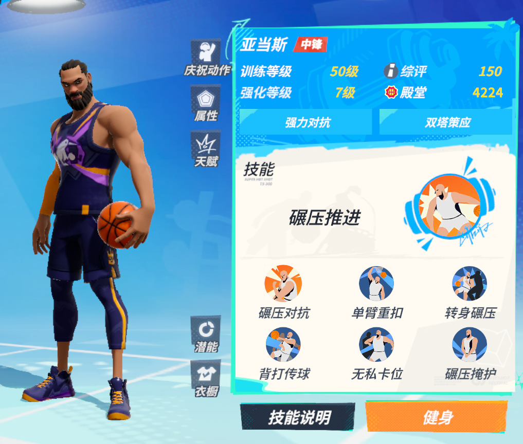 技能方面的话,亚当斯也有很多令人赞叹的手段,其中爆发技“碾压推进”是一个增加背打的技能,它使用后会让你的背打变得更加迅速,并且推进时还会有几率撞倒对手,背打到篮下后发起进攻还会有额外的抗盖帽加成,无论是衔接上篮和扣篮都十分好用。