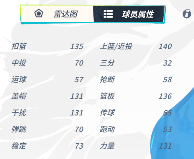 然后六维雷达图这块也是非常的有特点,其中最高的两项属性是内线进攻和内线防守,分别达到了134和120的水平,通过这两项数值可以打出十分不错的终结以及护框表现。