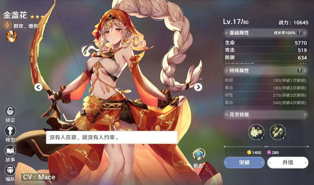 这个花灵游戏中的技能属于群攻技能和增伤收益,玩家们可以在初始面板中了解到这个花灵的基础属性生命值非常的优秀,同时防御和攻击力排第二。