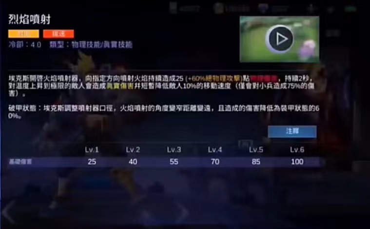 首先第1个技能烈焰喷射,使用火焰喷射器,朝着玩家想要的方向喷射一定数量的火焰,对敌人造成25点的攻击,这个伤害的持续时间为两秒钟,而且如果说火焰的范围为越来越大波及到周围的敌人,那么伤害效果也会持续增加,使用武器可以改变火焰的喷射状态以及喷射大小。