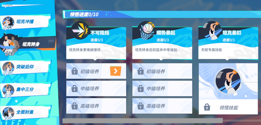 其他小技能里面优先级最高的是“坦克转身”,它提供一个成功率极高的过人动作,而且本身还有扣篮命中率加成,为其他的扣篮类小技能打下了夯实的基础。