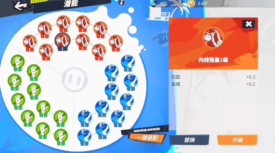 伙伴:潜能这块推荐采用红色内线怪兽,绿色火力封锁和蓝色内线冲锋的组合,这套组合提供给詹姆斯更强的扣篮能力和防守能力,同时对于篮板还有一定保护,对于詹姆斯是一个全面的强化。