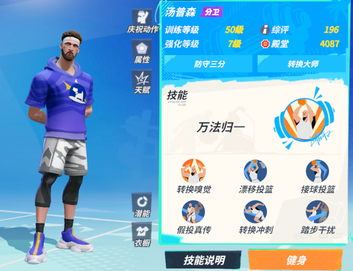 技能这块他的核心主动强势抓帽可以令其凶残的封盖对手,并直接取得球权,这对于之后的转换进攻非常有帮助,而且因为是主动触发的防守技能,所以使用起来也十分灵活。而被动这块,他则可以通过完成抢板和盖帽行为,来增加队伍整体的士气,队友也得已能更快开出技能。