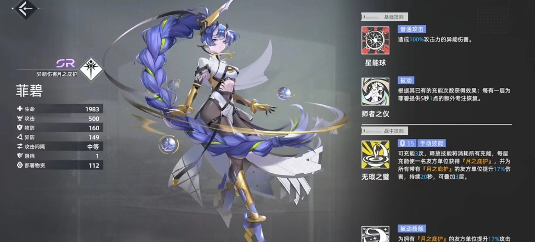 菲碧是一名SR角色,他所有的技能也都以控制为主,从属性面板上来看,输出不算很高,而且作为辅助的话,随机性比较大,但是他的跃迁技能还蛮好用的,辅助能力超强,能够在战斗的时候,在关键时候为队友提供很大的帮助,他的技能都是辅助类型的,比如说增益技能,以及治疗效果,不管是哪一个都可以有效的为团队提供帮助。