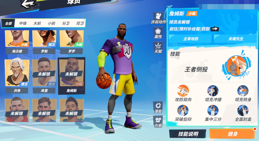 通过点进詹姆斯的球员面板你就可以发现这是一个主要依靠冲击篮筐来进攻的球员,他本身就有着上篮,扣篮和弹跳力量等对抗属性,所以一旦完成突破杀入内线,命中率会非常高,所以可以围绕突破扣篮这块来进一步拓展优势。另外他的盖帽数值也还不错,不过技能里只有“全面封盖”这一项提供盖帽支持,因此搭配潜能的时候还得多围绕盖帽进行一些补强。