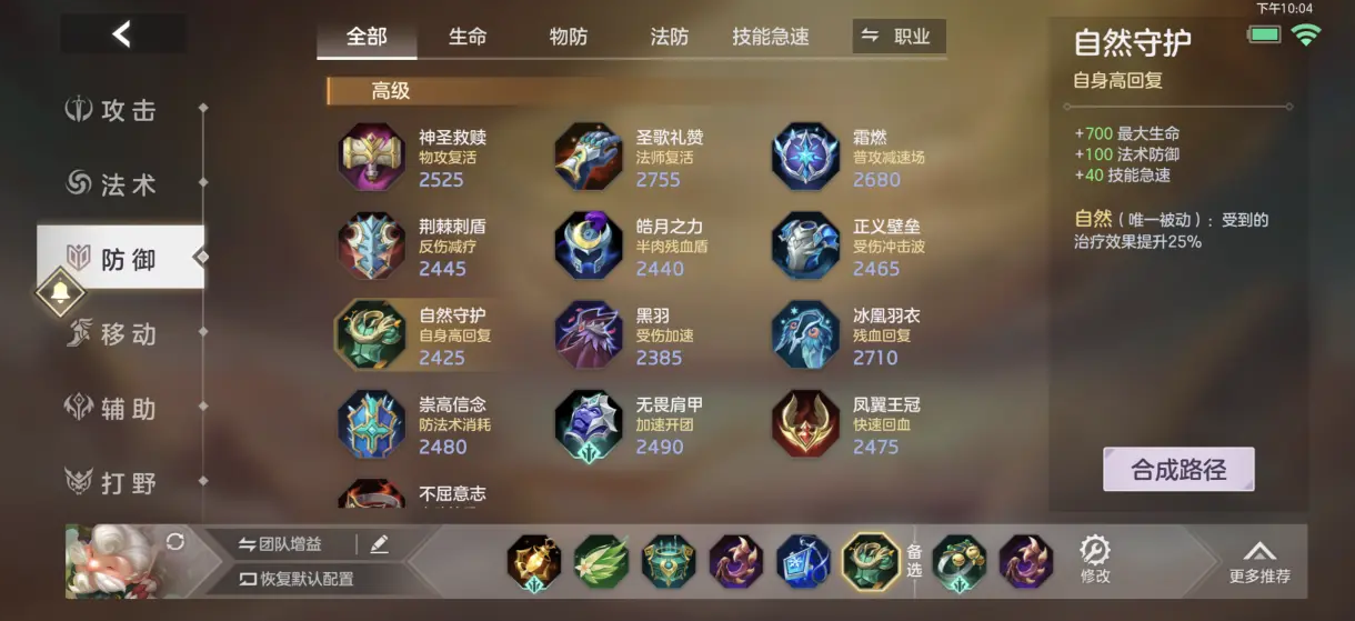除了以上两件核心装备之外,华佗的整体出装思路基本围绕着辅助队友,以及加快回蓝和法术冷却即可,为此可以为其配备神之佑护增强其治疗能力;装备深渊泉眼进一步降低其蓝耗;再配合疾风之靴加快移速,使其能快速跟团;再出一件圣歌礼赞保证其自身生存能力即可。
