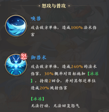 伤害这块,她主打的是魔法输出,不论是普攻还是必杀都是如此,两者都是单体法术伤害,不过后者的加成倍率达到了更高的240%,此外还有30%几率能对目标施加两回合的冰冻,冰冻触发后还能对附近单位溅射20%的伤害。