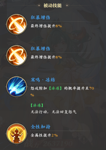 被动方面,她有着两个8%的增伤以及一个2%的全属性提升,然后独有的被动是“寒鸣·冻结”可以令其必杀冰冻敌人的概率提升至70%,进一步补足了绿萝的控制能力。
