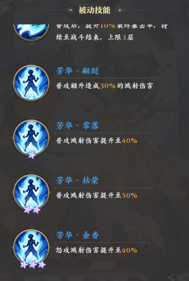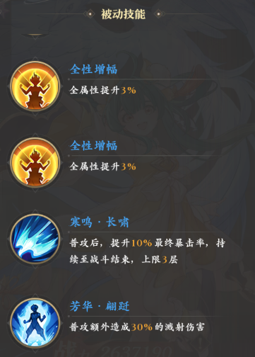 通过升级培养,绿萝后续还可以继续获得两个3%的全属性提升,它们让绿萝因此变得更加全面,后续还会新增两个独有的被动,分别是能在普攻后提升至多30%暴击的“寒鸣·长啸”以及能让普攻额外造成30%溅射伤害的“芳华·翩跹”。