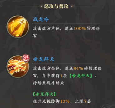 在技能这块,她的怒攻与普攻皆是物理伤害,其中怒攻可以攻击敌人全体,不过仅有84%的攻击加成,但使用后会为自身叠加一层帝龙摆天效果,可以做到无视敌人10%的防御,并且最多能叠加到5层。