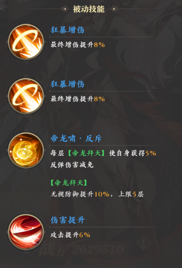 在被动方面,她拥有两个狂暴增伤,可以获得共计16%的增伤,专属的“帝龙啸·反斥”还可以令帝龙拜天额外提供5%的反弹伤害减免效果。此外,随着逐渐的培养,姜红英还会获得一个伤害提升与两个伤害强化,前者可提升6%攻击力,后者则提升9%攻击。