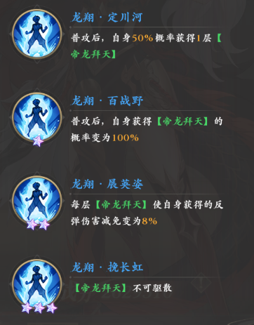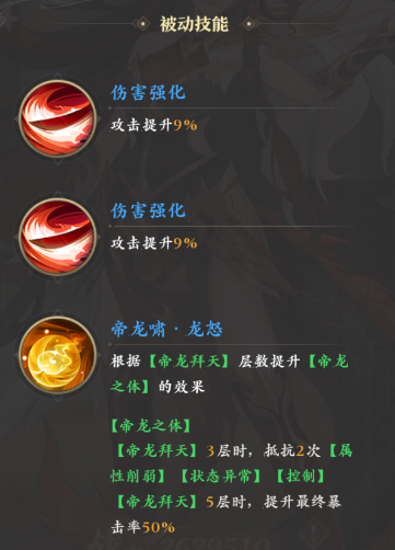 到中期姜红英还会有另一个专属的被动“帝龙啸·龙怒”,它可以令姜红英根据帝龙拜天的层数获取额外的帝龙之体效果,这些效果包含对负面状态的抵抗以及对暴击的提升。而随着后续的觉醒,姜红英又将新增普攻后获取帝龙拜天的能力,并且这一buff提供的伤害减免也将逐步提升,并变得不可驱散。