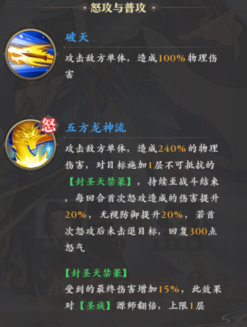 周元·圣龙的普攻“破天”是100%的单体物理伤害,十分稀疏平常,相较之下,他的怒气技能“五方龙神流”可以通过攻击单体敌人来造成240%的物理伤害,加成倍率非常之高,同时还可附加一层无法抵抗的“封神天禁篆”,该buff能令敌人所受伤害增加15%,对圣族源师还会有翻倍效果。