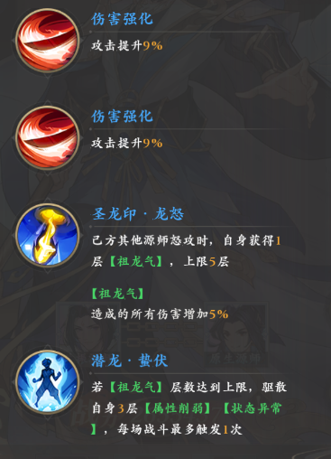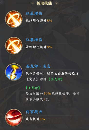 被动方面,他有着两个8%的增伤,一个6%的攻击提升和两个9%的攻击提升,此外,圣龙印系列被动中的“龙息”还能在开战时让攻击最高的友方获得30%暴击率加成。