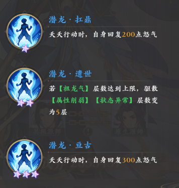 圣龙印系列的龙怒则可让周元圣龙在其他友方怒攻时获得1层能提供5%增伤的祖龙气效果,同时经过觉醒还能获取四种潜龙系列的被动效果,其中包括对debuff的驱散,以及对怒气的回复。