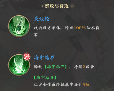 技能方面,他的怒气技是释放海牢结界,结界会持续两回合,身处其中的队友都会获得5%的抗暴率加成,应付暴击型敌人时会非常适用。