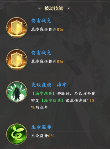其被动带来的百分比属性增益与多数辅助角色一样,提供的都是减伤和生命方面的数值,而他特有的被动“炎蛟盘旋”则令其在海牢结界结束后可以为全体友军恢复岘港与记录伤害值10%的血量。