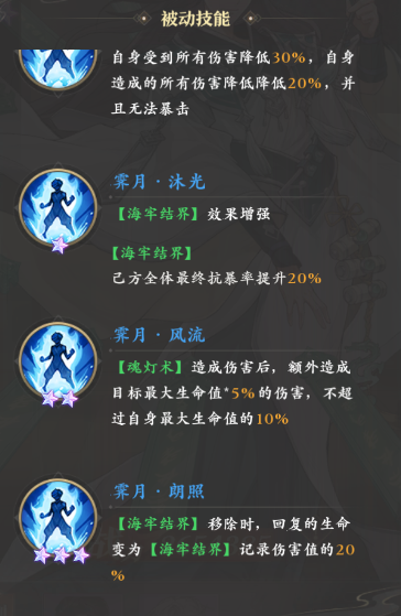 觉醒后叶秋还会获得额外的减伤,同时免疫暴击,到一星后,海牢结界将进一步加强,全体都会获得20%抗暴率的提升,二星时则会增强“魂灯术”的伤害,三星则会提升海牢结界消失后的回血量。