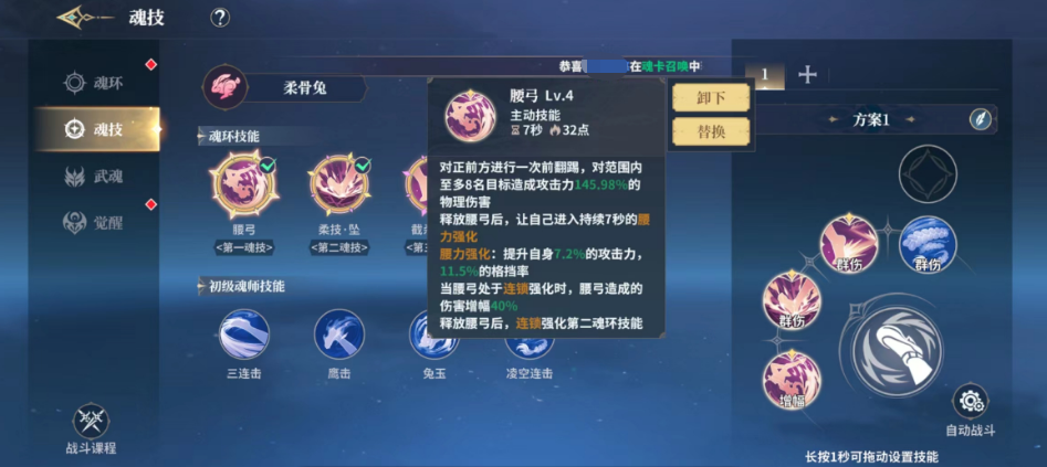 腰弓技能是它的第一个主动技能,使用的时候在上面可以带来一个翻踢的动作,带来的输出也是145%的数值,不过伤害就是物理伤害,使用这个技能之后会进入一个强化腰力的状态里面持续7秒的时间,这个效果在上面是可以提升输出的。三连击这个技能是属于一个小范围的输出,带来的伤害也之后30%的伤害,所以后期等级提升之后大家就可以换掉。