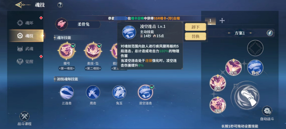 其次是一个鹰击的技能,使用这个技能可以带来140%的武力伤害,还可以帮助拉一下仇恨。兔玉这个技能是一个带来爆炸伤害的技能,在魂力球发生爆炸的时候周围的敌人都会有130%的伤害,这个技能效果还可以强化后面的技能。最后一个主动技能是凌空连击,原本的输出是180%的输出,但是有前面的强化之后,就会在这个数值上面再次提升8%。