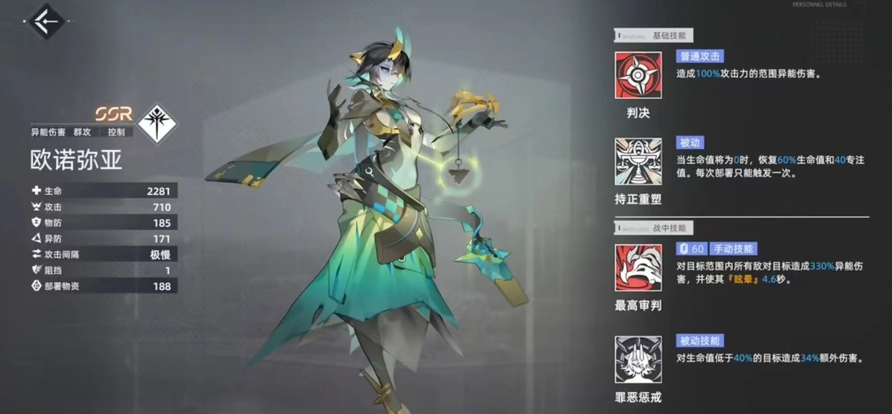 欧诺弥亚是一个SSR角色,可以看得出来等级是挺高的,输出能力及控制能力都不错,同时还拥有辅助的能力,所以不管是从品质还是稀有度这方面来看,都是非常高的,它的技能里面最好用的就是控制技能以及群攻输出技能,他的一技能能够在有限范围里面使敌人陷入到眩晕状态中,这样就可以很好的将敌人给控制住,二技能则是能够让角色自身的输出伤害提升,并且持续时间较长,在法师里面算是非常强的一个角色。