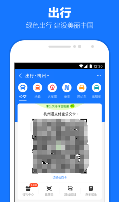 现在大家能够实现手机支付也有一大部分原因得益于支付宝。这里不仅给大家提供了安全可靠的线上交易服务,在这里可以完成转账收账。而且最近给大家提供了出行服务。点击主页面的出行服务,就会给用户提供不同选择的出行服务。例如可以给大家提供乘车时的二维码。大家只需出二维码扫一扫就可以轻松乘车。