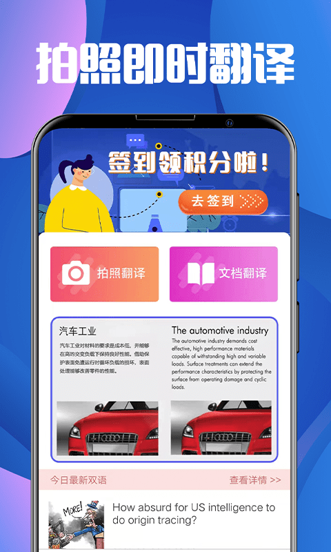 它属于口袋翻译工具,摒弃了复杂无用的功能,体积小巧,运行流畅,支持离线翻译。软件实现智能拍照翻译和生成文章,解决了用户头疼商务会议记录和信函等写作难题。