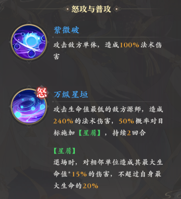 技能这块,其怒气技对于单体残血敌人有着很大威胁,不仅能自动攻击血量最低的敌人,而且还可以造成足足240%的法术伤害,并且它还有一定几率给敌人施加持续两回合的星屑效果,这一效果会在持有者死亡时产生爆炸,从而溅射相邻单位15%最大生命值的伤害,用来打收割会十分给力。