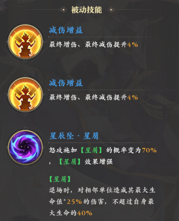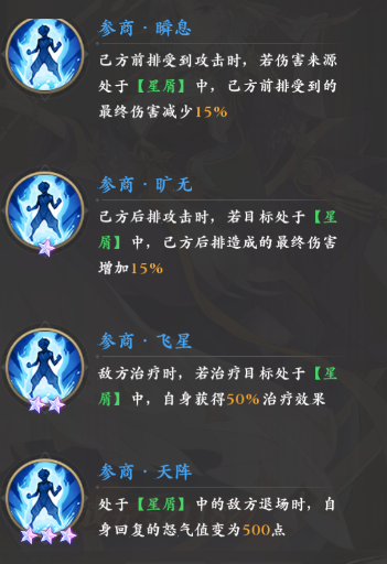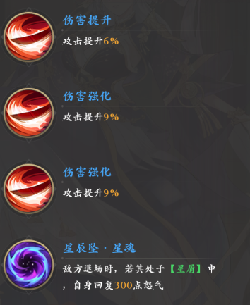 然后“星辰坠·星魂”还对紫霄的怒气回复提供了帮助,星屑状态下的敌人阵亡时自己会恢复足足三百怒气,后续得以更快的施放怒气技,最后就是觉醒状态下的四个被动,它们可以进一步增强敌人退场时紫霄的怒气回复,同时还可以增强己方后排的伤害和前排的承伤能力,另外还可以在敌方治疗星屑目标时让紫霄也获得一半的回血量。