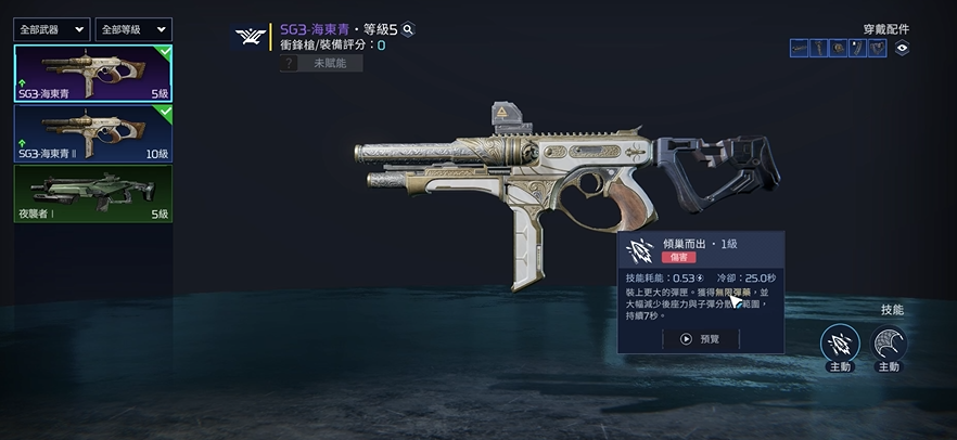 如果要在游戏中的众多武器中找到一个最适合打本的武器,那么冲锋枪sg3-海东青必然是各位的首选,这把武器不但拥有冲锋枪标志性的高射速,并且能通过开启技能让使用者在7秒内进入无限子弹的状态,同时还可以很大程度上减少这把武器的后坐力以及子弹落点的分散范围,使其秒伤直线上升,在对付boss的时候能够一口气打出极为恐怖的秒伤;同时这把武器还拥有控制敌人的技能,在对付一些精英怪的时候有奇效。