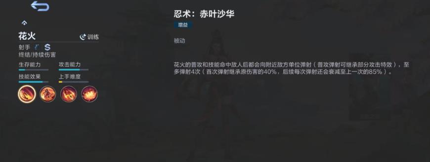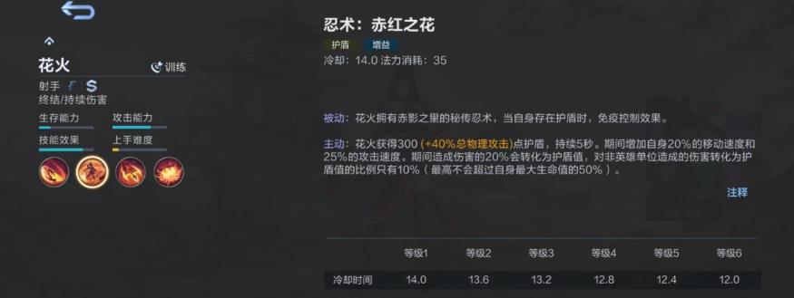 他的被动技能“赤叶沙华”,可以让火焰在普通攻击或技能击中目标时,对目标造成一定的伤害,并附带一定的攻击力,可以连续释放四次,并且造成的伤害会越来越低。这个被动技能让赤影之花拥有了强大的清兵能力,当它的攻击力提升到一定程度之后,只需要一个跳跃就可以迅速的清兵,在接下来的战斗中,赤影之花就是靠着普通的跳跃和跳跃来输出的。