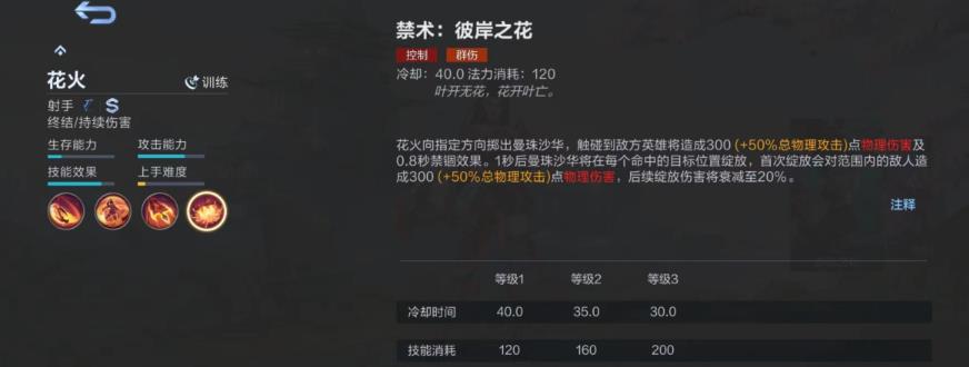 他的终极禁咒“曼珠沙华”,也是他目前最强的一个限制技。他将曼珠沙华投掷到了一个特定的位置,当接触到敌人的时候,曼珠沙华就会释放出来,对敌人造成一定的伤害。虽说这一招的施法要求很高,但是在团战中却是极具杀伤力的,因为这一招能够很好地牵制对方的英雄,从而给己方制造出获胜的机会。