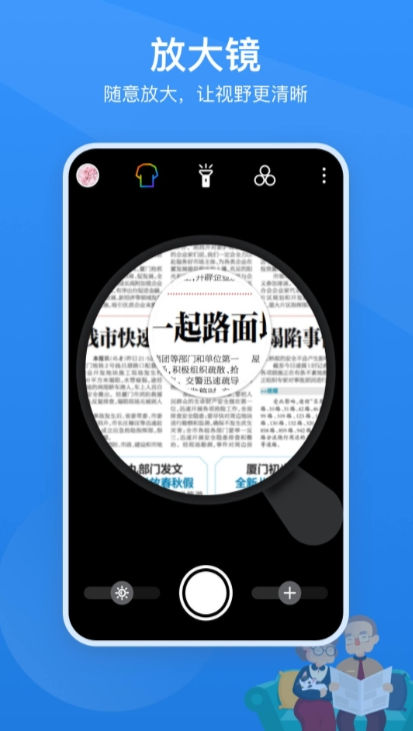 如果你想使用一款可以放大阅读的神器,那一定要下载读屏放大镜APP。在应用上,可以对文字进行放大阅读,而且还有着独特的夜视功能帮助用户在晚上进行阅读,还可以将自己拍摄的照片进行放大。