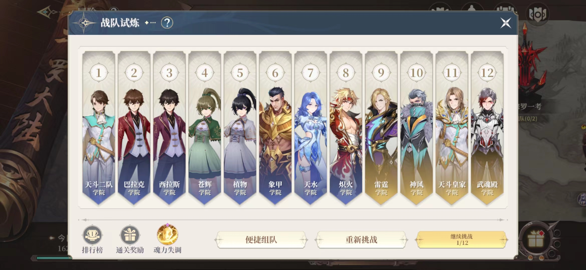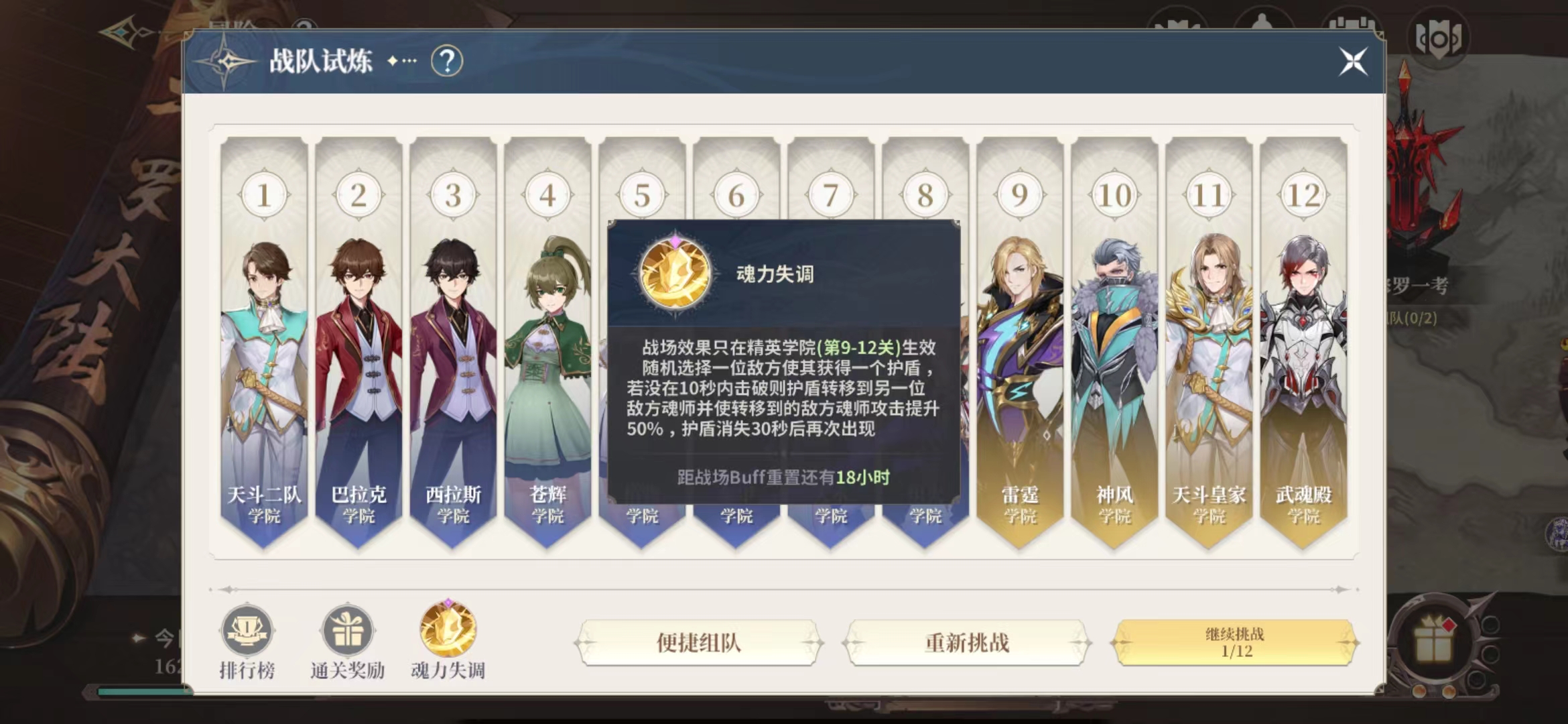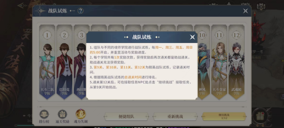 通关时间最后会组成一个排行榜,目前是一共有12个学院可以挑战,在将12个学院都挑战成功之后大家就可以去接取任务的NPC那里,跟他交互之后点击继续挑战,这个时候进度就会重新重置在第9关,每一次参与战队试炼其实大家也可以看见页面下面的一个buff,有这个buff大家通关的效率会更高。