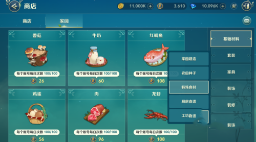 其实,除了一些特定的活动或者任务外,大部分的特殊食材都可以通过家园商店购买。家园商店是一个位于家园中心的商店,玩家可以用金币或者其他资源来兑换各种物品,包括特殊食材。目前测试版本中,共有六种特殊食材,分别是香菇、牛奶、红雕鱼、鸡蛋、肉和龙虾。每种特殊食材每天限购100次,超过后就不能再买了。