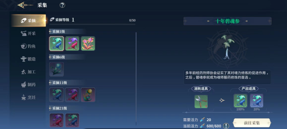 采集:这个生活技能就是大家最容易获取的一个生活技能,大家在野外地图上可以看到很多的药物,根据药物的等级大家就可以去进行采集,但是采集的过程是会消耗工具以及活力的,采集来的药物可以利用锻造工具台来锻造半成品哦。