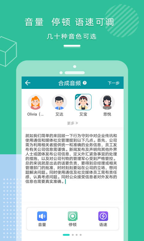 它充当自动音频编辑工具,一键文字转语音,直接复制和编辑内容,通过几百位主播实时编辑,创作出多种音频效果,定制出良好配音效果,混合多种声音,直接生成文件。