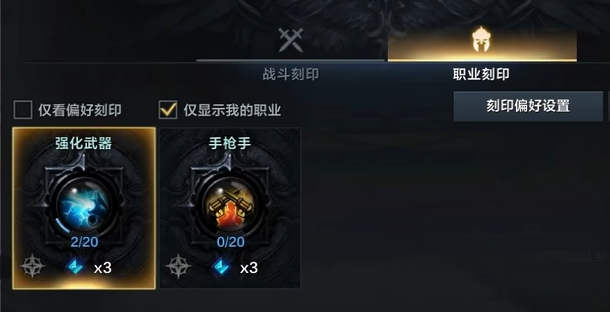 玩家可以使用“Alt L”直接打开刻印系统,也可以在游戏的右下方选择进入,玩家会发现在转职后,原本一无所有的职业刻印多出了两个,这两个刻印则是转职后职业所自带的。