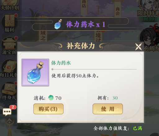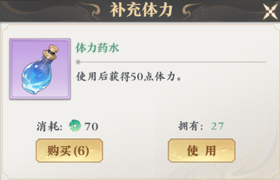 第二种则是使用体力药水进行补充,这种方法相较于自然恢复会更有效率,每瓶药水可以补充50点体力,这些体力足够帮你多闯十次关卡了,不过需要注意的是体力药水的获取是需要消耗源晶的,每瓶的价格为70源晶,并且每天还有限购次数。