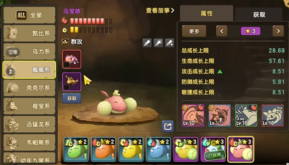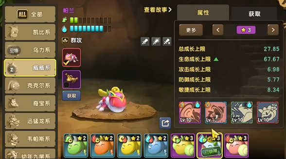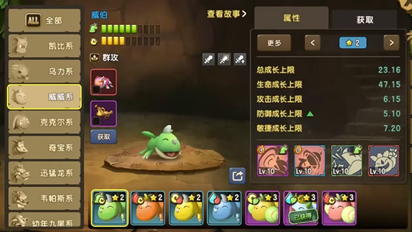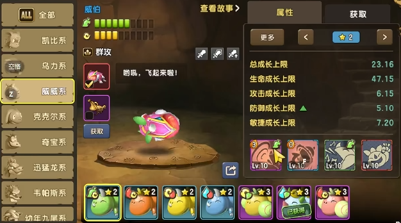 大家都知道,新石器时代的众多宠物根据其属性倾向是有着不同的划分的,比如有些宠物专攻力量属性,而有些宠物则擅长辅助,而威威系宠物则是天生的输出宠物——在游戏中的四种初始宠物里,威威系宠物的敏捷属性和攻击力成长都是其中的佼佼者,同时威威系宠物还十分擅长使用她的群攻技能来解除敌方的buff,因此无论是pve还是pvp,这个宠物都是十分热门的攻击型选手。