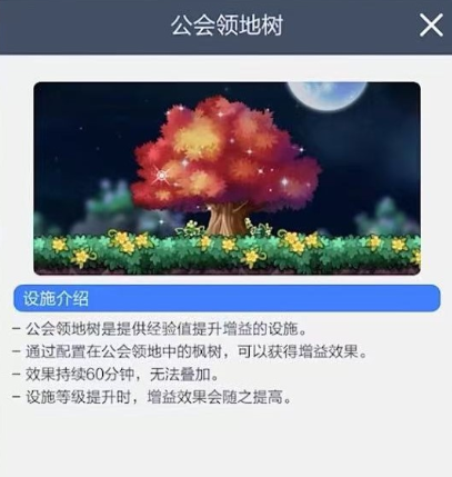 公会大树是一颗红色的枫叶树,它代表着公会的荣耀和力量。要想拥有这颗大树,需要对公会内的建筑进行升级,达到一定的级数后才能解锁。每个公会只能有一颗大树,所以这也是一种展示公会实力的方式。公会大树的功能是让公会成员在此处使用“祈福”功能,祈福后可以得到一个经验值加成的buff效果。