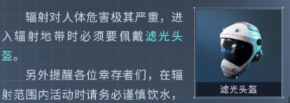 为了应对这种辐射环境,玩家可以准备滤光头盔,这种头盔可以将有害粒子过滤掉,除了戴头盔之外,建议将皮肤包裹起来,以免皮肤受到辐射。来到这里之后,尽量不要饮用当地水源,可以通过滤瓶将水源过滤,以免影响身体健康。