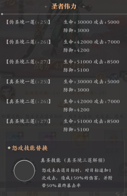 当然,境界的提升还是不能松懈的,主要它每次提升都能给予大量的生命和攻防属性,满境界之后更是可以直接让你的怒攻被替换为效果更强,数值更高的强力技能,所以其带来的收益还是匹配得上其高额的付出的。