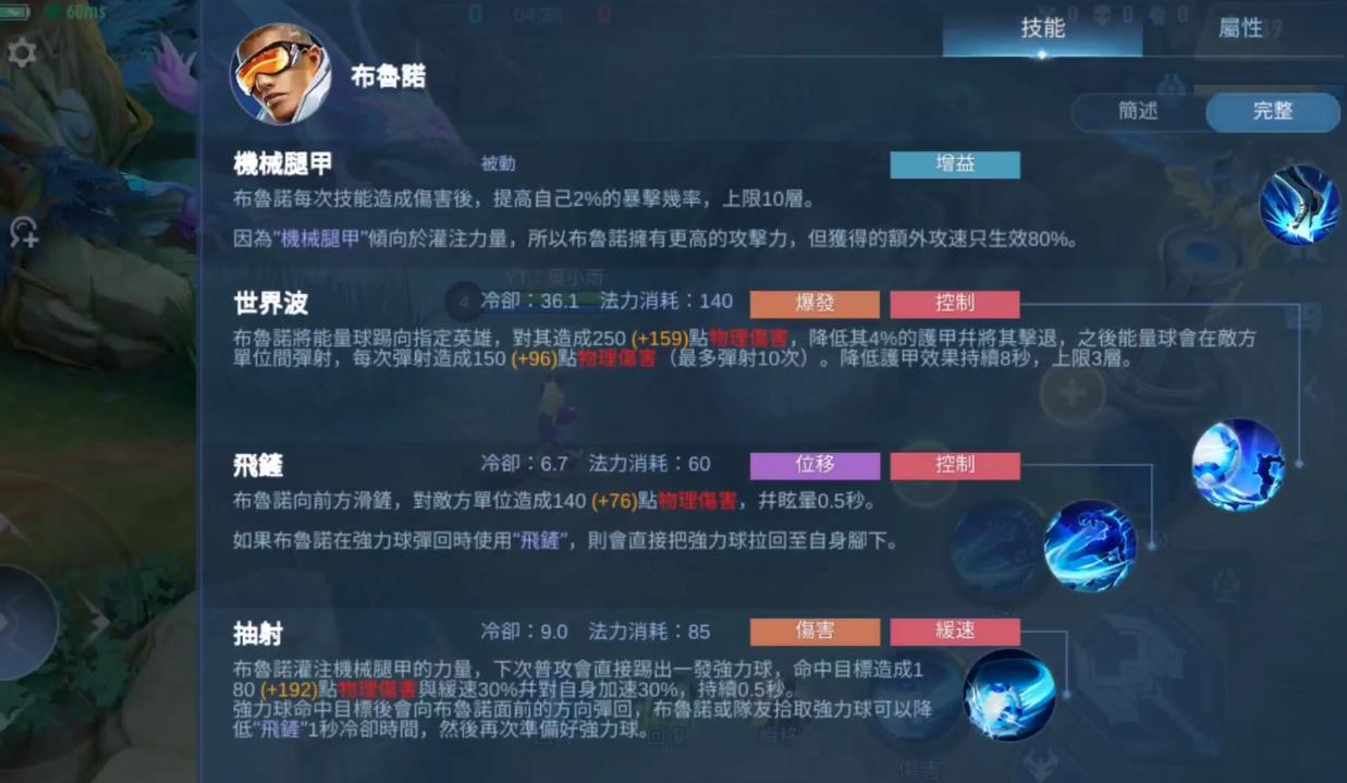 脚踢(1级):布鲁诺最主要的一项能力,使用‘机械腿装甲’的威力,可以将一记‘强力球’踢出去,使对手受到一定程度的物理伤害,并使其行动迟缓。在用这一招的时候,要注意小球的反弹,注意小球的回弹,注意小球的收起,这样可以减少大球的 CD,保持持续的伤害。