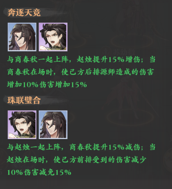 然后苏幼微和赵烛两个都是进攻职业,他们分别能威胁后排敌人和单体敌人,同时前者还有着击杀刷新机制,另外值得一提的是这套阵容的赵烛和商春秋能够互相触发羁绊,以此分别获得15%增伤和15%减伤,这些效果可以让他们的攻防表现变得更加亮眼。