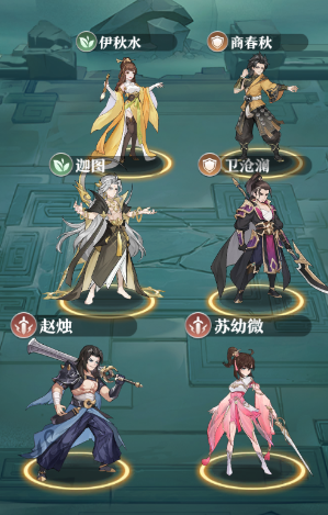 阵容配置为“卫沧澜 商春秋 伊秋水 迦图 赵烛 苏幼微”,这套阵容的两个前排都非常顶,因为他们分别具有自我加盾和自我减伤能力,可以完美吸收敌人的大部分伤害,队伍的后排角色因此免受于难。