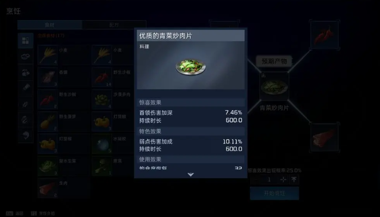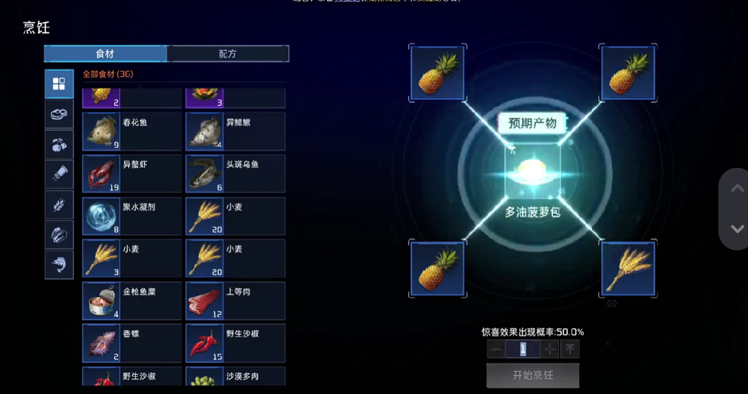 游戏中最常见的食材大致分为肉类、水果、调料、谷物和蔬菜这5类,而制作水果肉串的材料种类不多,只用到了水果类和肉类。将食材放在烹饪台,直接点击任何一款肉类和水果,选择完毕后就可以开始烹饪了,其他的食物配方可根据所剩的资源进行选择。