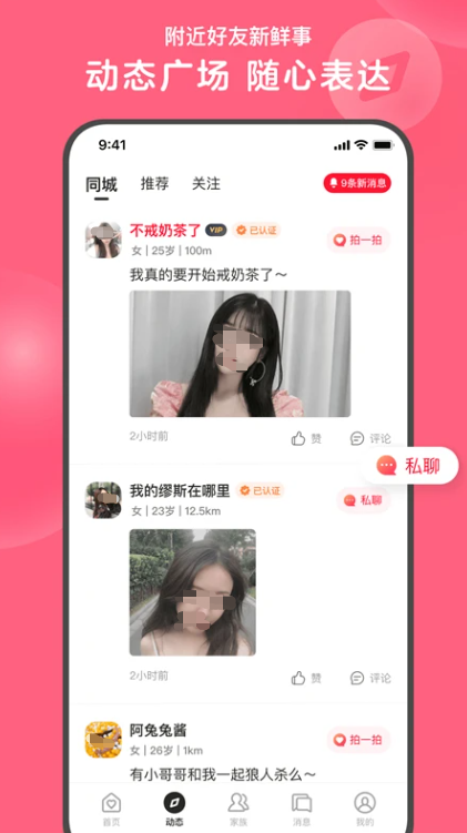 这款软件上面的用户比较活跃,实行聊天实名制注册机制,而且还要经过实人的视频认证,交友更加真诚开门见山。软件里面有同城动态发布的玩法,公开朋友圈让有缘人发现,结交更多兴趣圈子的好友,还有软件智能匹配功能帮内向的你找对象。